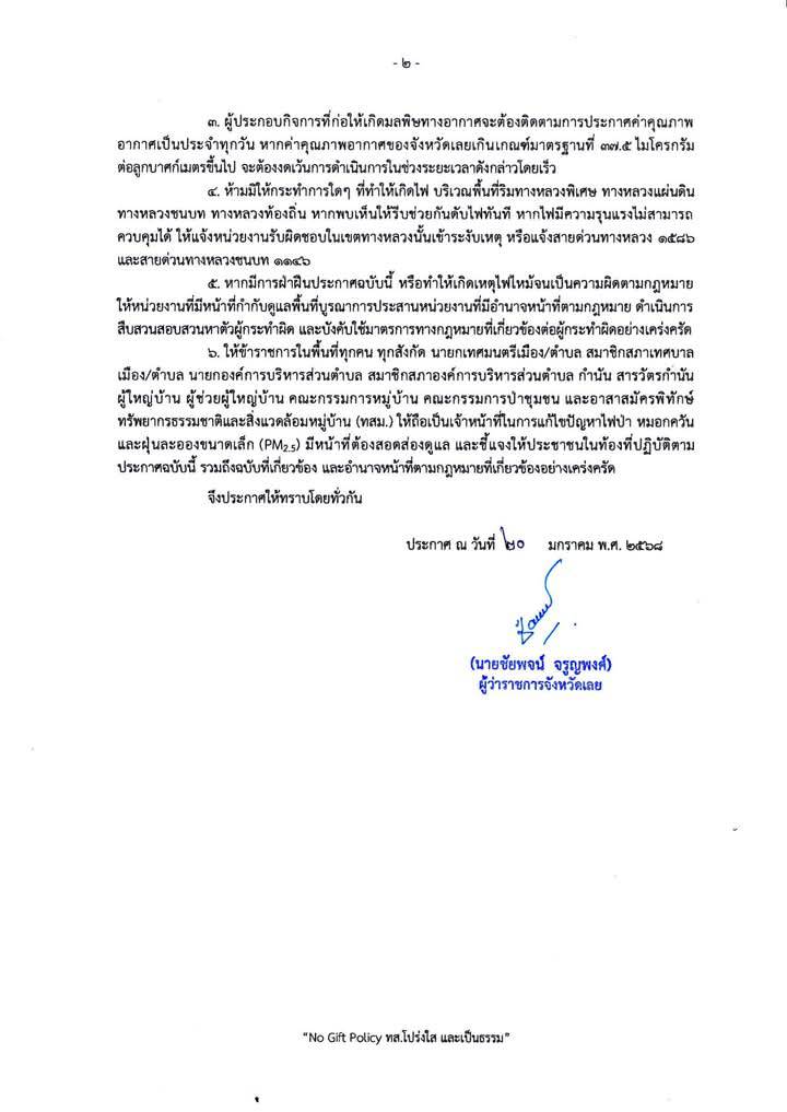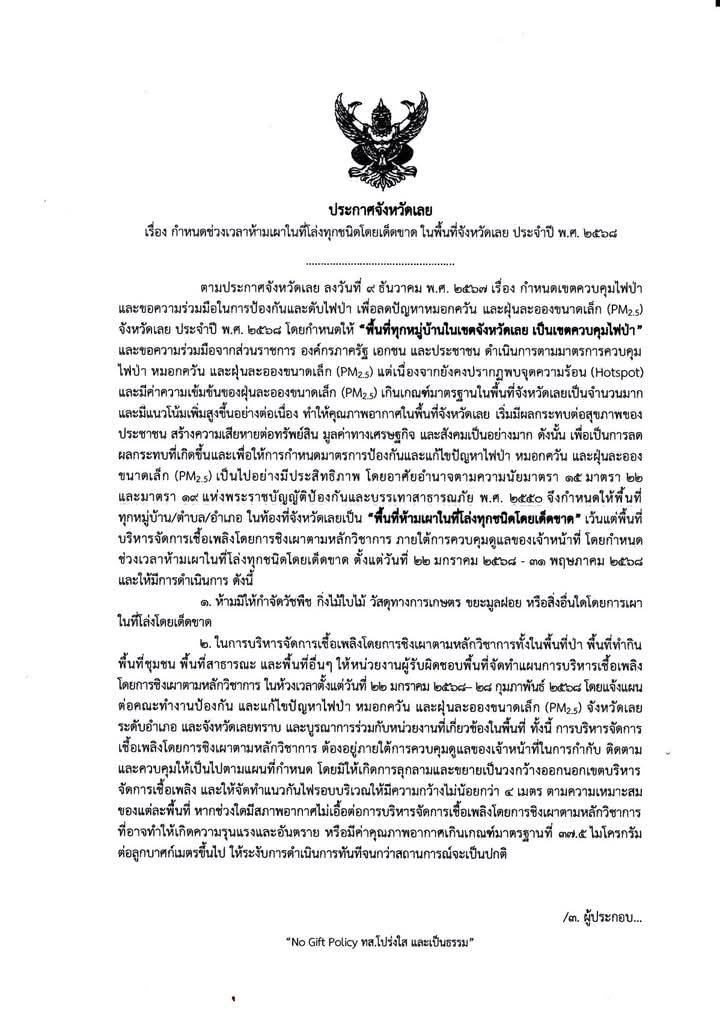 ประกาศจังหวัดเลย… ห้าม!! เผาในที่โล่งทุกชนิดโดยเด็ดขาด!! ตั้งแต่วันที่ 22 มกราคม – 31 พฤษภาคม 2568 หากฝ่าฝืนให้มีการบังคับใช้มาตรการทางกฏหมายต่อผู้กระทำผิดอย่างเคร่งครัด