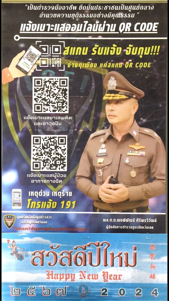 ออกประชาสัมพันธ์ช่องทางการแจ้งเบาะแสออนไลน์ผ่าน QR CODE, มอบปฏิทินปีใหม่ 2567 ให้แต่แก่ประชาชนในพื้นที่อำเภอเอราวัณ และติดปฏิทินในจุดสำคัญที่มีประชาชนพลุกพล่าน