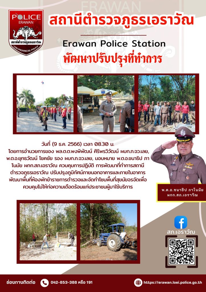 วันที่ (9 ธ.ค. 2566) เวลา 08.30 น.โดยการอำนวยการของ พลต.ตพงพิพัฒน์ ศิริพรวิวัฒน์ ผบกภจวเลย,พ.ตอยุทรวัฒน์ โชคชัย รอง ผบกภ.จวเลย, มอบหมาย .ต.อชนาธิป ภาโนมัย ผกก.สภ.อราวัณ ควบคุมการปฏิบัติ การพัฒนาที่ทำการสถานีตำรวจภูธรเอราวัณ ปรับปรุงภูมิทัศน์ภายนอกอาคารและภายในอาคารพัฒนาพื้นที่ห้องพักข้าราชการตำรวจและจัดทำโซนพื้นที่สุขนัขจรจัดเพื่อควบคุมไม่ให้ก่อความเดือดร้อนแก่ประชาชนผู้มาใช้บริการ