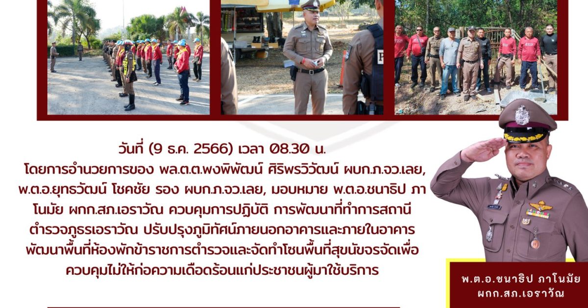 วันที่ (9 ธ.ค. 2566) เวลา 08.30 น.โดยการอำนวยการของ พลต.ตพงพิพัฒน์ ศิริพรวิวัฒน์ ผบกภจวเลย,พ.ตอยุทรวัฒน์ โชคชัย รอง ผบกภ.จวเลย, มอบหมาย .ต.อชนาธิป ภาโนมัย ผกก.สภ.อราวัณ ควบคุมการปฏิบัติ การพัฒนาที่ทำการสถานีตำรวจภูธรเอราวัณ ปรับปรุงภูมิทัศน์ภายนอกอาคารและภายในอาคารพัฒนาพื้นที่ห้องพักข้าราชการตำรวจและจัดทำโซนพื้นที่สุขนัขจรจัดเพื่อควบคุมไม่ให้ก่อความเดือดร้อนแก่ประชาชนผู้มาใช้บริการ