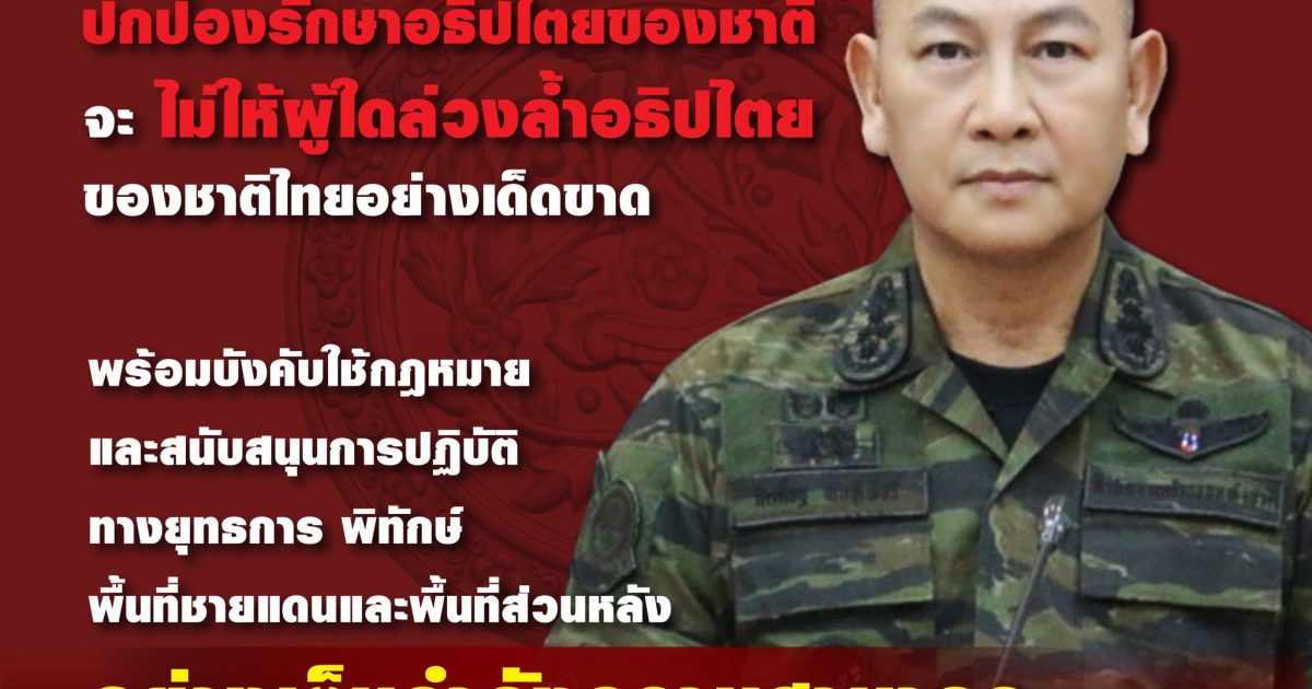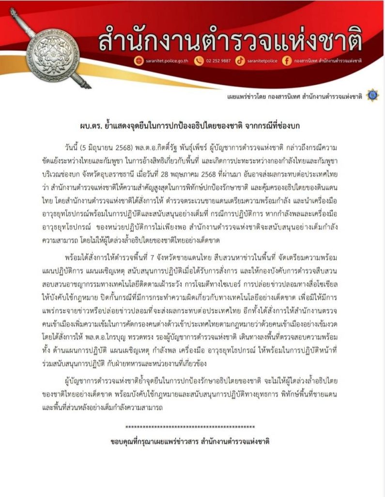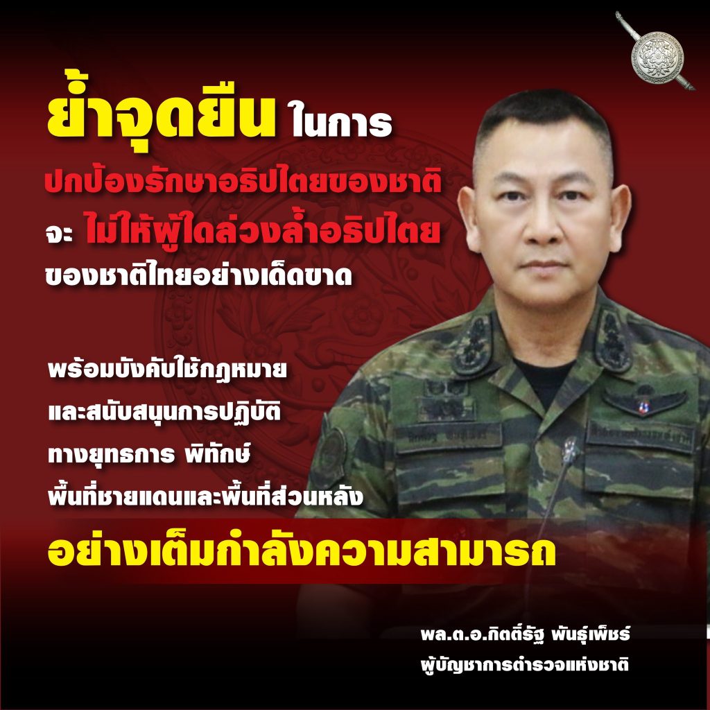 ผู้บัญชาการตำรวจแห่งชาติย้ำจุดยืนในการปกป้องรักษาอธิปไตยของชาติ จะไม่ให้ผู้ใดล่วงล้ำอธิปไตยของชาติไทยอย่างเด็ดขาด พร้อมบังคับใช้กฎหมายและสนับสนุนการปฏิบัติทางยุทธการ พิทักษ์พื้นที่ชายแดนและพื้นที่ส่วนหลังอย่างเต็มกำลังความสามารถ
