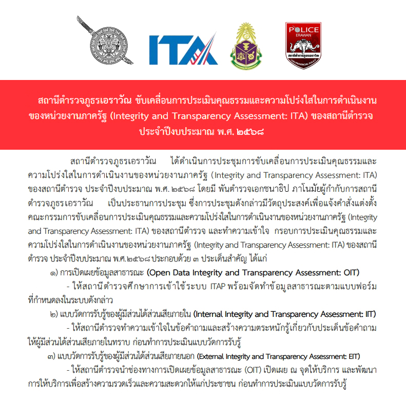 ประชาสัมพันธ์ข้อมูลการประเมินคุณธรรมและความโปร่งใสในการดำเนินงานของหน่วยงานภาครัฐ (Integrity and Transparency Assessment: ITA) ของสถานีตำรวจ ประจำปีงบประมาณ พ.ศ. 2568